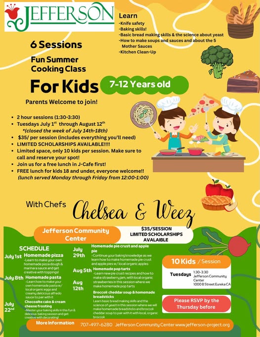 The Kids Summer Cooking Classes at The Jefferson Project Tuesdays 1:30-3:30 July 1st-August 12th (Closed July 15th) Register by phone the Thursday before class Join us for a free lunch in J-Cafe before class. Free lunches for kids 18 and under all summer starting Monday June 23rd to Friday August 15th (Closed July 14th-18th) (fb)