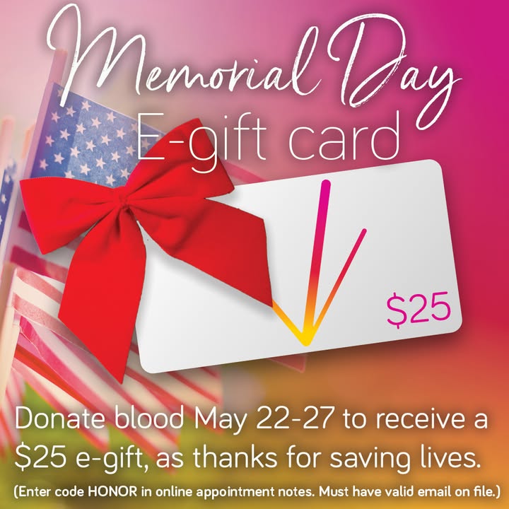 Heroes come in many forms. This week, be one of them. Donate blood with Versiti between May 22–27 to honor those we remember on Memorial Day. Use code HONOR when you schedule online and receive a $25 e-gift card as our thank-you. Your gift matters. Let’s save lives together. 📅 Book now: https://bitly.versiti.org/3DaSHlw #HopeItsInOurBlood #DonateBlood #MemorialDayHeroes #VersitiCares (fb)