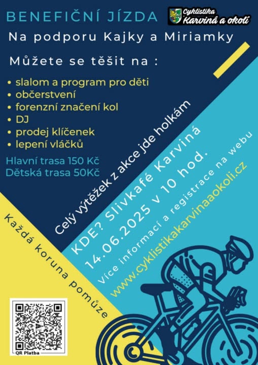 POMOZTE KAJCE A MIMI CHARITATIVNÍ JÍZDOU, UŽ ZÍTRA! Přijď pomoci dvěma holčičkám Kajce a Mimi trpícím mozkovou obrnou, epilepsií a dalšími přidruženými nemocemi. U kavárny Slivkafé bude v sobotu 14. června uspořádána Benefiční jízda na podporu děvčátek. Od 10:00 hodin se můžete těšit na slalom a program pro děti, občerstvení, forenzní značení jízdních kol, lepení vláčků, prodej klíčenek a další. Od 11:00 je připraven start kratší trasy pro děti, v 11:15 bude startovat hlavní trasa. Prosíme, abyste se registrovali na webu https://www.cyklistikakarvinaaokoli.cz/, kde najdete veškeré informace k této charitativní akci. (fb)