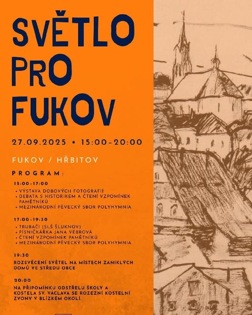 Připomeňme si společně 65. výročí odstřelu fukovského kostela sv. Václava a zániku této obce, severně od Šluknova. Program bude složení z přivítání návštěvníků, vystoupení trubačů ze Střední lesnická škola a Střední odborná škola Šluknov , debaty s historikem, čtení vzpomínek pamětníků, vystoupení písničkářky Jany Vébrové či mezinárodního pěveckého sboru Polyhymnia, Jiříkov a také výstavy fotografií nebo rozsvěcení světel na místech zaniklých domů ve středu obce. Ve 20 hod. pro připomínku odstřelu školy a kostela sv. Václava se po obou stranách hranice rozezní kostelní zvony V průběhu akce bude zajištěna ochutnávka regionálních pokrmů. Akce je financována i díky programu "Nestůj s rukama za zády", kterou podpořila naše nadace, Air Products CZ & SK a Fond Martiny a Milana Ryšavých. Více na Světlo pro Fukov (fb)