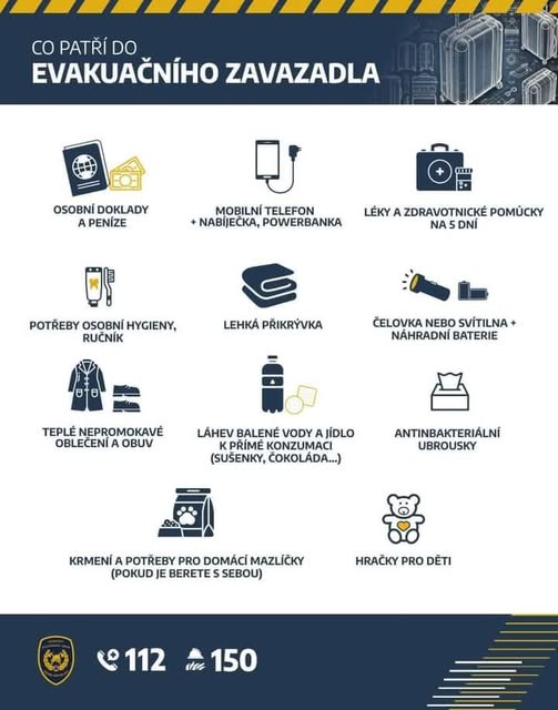 Všichni tušíme, že situace dle předpovědi počasí bude v následujících dnech složitá. Pokud se nacházíte v ohrožené oblasti,tak by bylo dobré mít pro případ nouze připravené evakuační zavazadlo. Návod co do něho naleznete na obrázku od kolegů z HZS ČR. Buďte na sebe všichni opatrní a pamatujte, že kdo je připraven není překvapen. (fb)