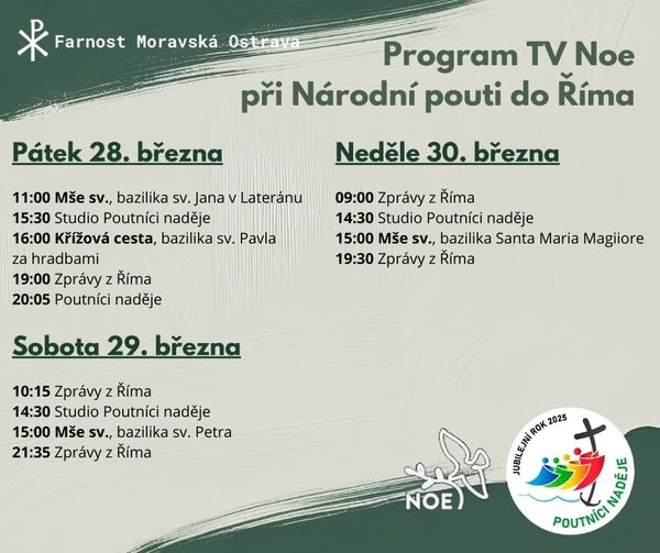 🇨🇿 NÁRODNÍ POUŤ 2025 🇻🇦 Pro všechny, kteří se nemohou osobně zúčastnit Národní pouti v Římě, přinášíme program TV Noe 📺 s přímými přenosy poutních akcí. Diecéze ostravsko-opavská Tv Noe (fb)
