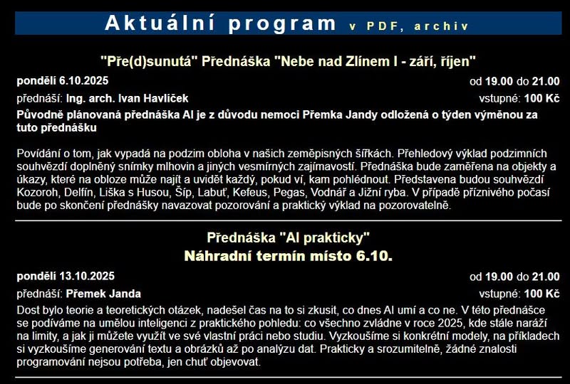 Pozor, změna v programu❗ Z důvodu nemoci Přemka Jandy jsme bohužel nuceni pondělní přednášku o AI přesunout.😢 Dojde tak k záměně termínů s přednáškou z cyklu "Nebe nad Zlínem". Přednáška tedy nebude zrušena, pouze posunuta na termín 13.10. 2025. Zítra, v pondělí 6.10., se tak příchozí návštěvníci mohou zdokonalit v poznávání podzimní oblohy v podání Ivana Havlíčka. Za případné nepříjemnosti se omlouváme, nicméně výměnu přednášek považujeme za vhodnější než zrušení termínu úplně a hledání termínu náhradního. Děkujeme za pochopení, těšíme se na Vás na některé z přednášek. (nebo klidně na obou 😉) (fb)