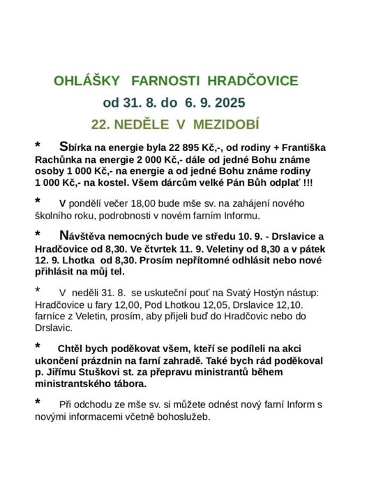 [1] https://farnosthradcovice.cz [2] https://farnosthradcovice.cz/default/default/8561_porad-bohosluzeb [3] https://cs.wikipedia.org/wiki/%C5%98%C3%ADmskokatolick%C3%A1_farnost_Hrad%C4%8Dovice [4] https://www.ado.cz/katalog/www/farnosti/hradcovice [5] https://sk.mapy.cz/?id=1271792