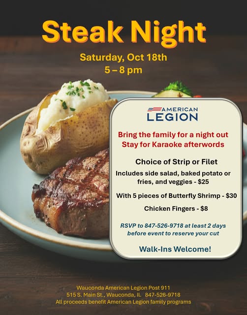 Attention Contact for Hall Rentals Shannon Nichols Ph 847 6524995Send Email to Shannon Bar Specials Lightning Raffle Sunday at 3pmThrough April Resumes in October Bar Bingo Every Other Thursday at 7pmPRIZES. Trivia Night Every Monday 7 9pmPRIZES. LunchDinner at the Legion Mon Lunch Soup of the DayMon Dinner Sliders wChipsTues Lunch Meatball SandwichTues Dinner Taco Tuesday MenuWed Lunch Spaghetti or Cooks ChoiceWed Dinner Sloppy JoesThur Lunch Hot Italian SubsFri MiniItalian BeefsLunch is 11am 2pm while supplies last Taco Tuesday Southwestern menu every Tuesday from 5pm to 715pm except Tuesdays after major holidays Click picture for full menu Sloppy Joes wchips Every Wednesday 5pm to 8pmwhile supplies last Steak Night Choice of strip or filet dinner every 3rd Saturday of the month 25From 5pm 8pm Click picture for full details Please join us for Karaoke The first and third Saturday of each month from 8 PM to Midnight. Video Gaming A video gaming room is adjacent to the main bar area.