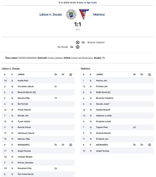 Po zápase s Věžnicí zůstal doma pouze jeden bod! Od začátku zápasu jsme byli výrazně lepším mužstvem a drželi jsme se na míči. Hosté, kteří přijeli pouze ve 12 lidech, zvolili taktiku zahuštěné defenzivy kolem vlastního vápna, a dobývání tak bylo velmi složité. O to víc, když se hosté ve 32. minutě prosadili – jediný hráč prošel středem hřiště naší obranou jako nůž máslem a přesně zakončil. O chvíli později, ve 36. minutě, se prosadil Němec, který po kombinaci ve středu hřiště pádil sám na brankáře a nemýlil se. Přes pevnou defenzivu soupeře jsme se jen těžko dostávali do vyložených šancí. Bušili jsme na dveře, ale rozbít se nám je nepodařilo. I když jsme si několik šancí vytvořili, branka nepadla, a tak z tohoto zápasu odcházíme pouze s jedním bodem. Příští zápas odehrajeme ve Starém Ransku v sobotu od 16:00. TJ Sokol Libice nad Doubravou (fb)