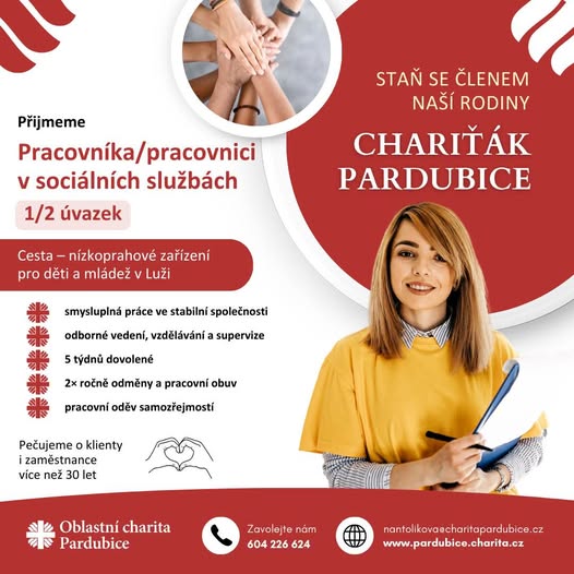 🔎 Hledá se PRACOVNÍK / PRACOVNICE V SOCIÁLNÍCH SLUŽBÁCH na zkrácený úvazek ❤️ Někdy stačí jedno povzbuzení, jeden člověk, který naslouchá a věří ve vás. A právě teď hledáme do týmu někoho, kdo chce být oporou dětem a mladým lidem, kteří potřebují bezpečný prostor, pochopení a někdy i pomocnou ruku 😊 👦 Kde? Cesta - Nízkoprahové zařízení pro děti a mládež v Luži. 💼 Kdo? Pracovník / pracovnice v sociálních službách na 1/2 úvazek (20 hod. týdně). 💙 Proč? Protože každé dítě si zaslouží mít někoho, kdo mu pomůže najít cestu. Co ti nabízíme? ✔ Smysluplnou práci v přátelském týmu – každý den máš možnost měnit životy. ✔ 5 týdnů dovolené, příspěvek na stravování a pracovní oblečení. ✔ Odborné vedení, supervize a možnost vzdělávání. ✔ Po zapracování příspěvek na penzijko – protože víme, že pečovat o druhé znamená pečovat také o sebe 🙂 ✔ Hrubou mzdu 12 950 Kč měsíčně. Co od tebe očekáváme? ✅ Otevřené srdce pro děti a mladé lidi. ✅ Čistý trestní rejstřík. ✅ Ochotu učit se a být tu pro ty, kteří to potřebují. ✅ Časovou flexibilitu (někdy s námi zůstaneš i do 17 hod.). ✅ Kurz pracovníka v sociálních službách (pokud ho nemáš, pomůžeme ti ho získat!). 🌟 Pokud ti záleží na dětech, chceš jim být průvodcem v náročných situacích a věříš, že každý má šanci na lepší budoucnost – pak jsi náš člověk ❤️ 📩 Ozvi se nám! Nebo rovnou pošli životopis a pár slov o sobě v motivačním dopise na e-mail níže. 🙋🏼♀️ Nikola Antolíková, vedoucí Nízkoprahu 📧 nantolikova@charitapardubice.cz 📞 604 226 624 Cesta čeká na tebe. Pomůžeš dětem najít tu jejich? 🙂 Více zde: https://pardubice.charita.cz/aktualne/volna-mista/pracovnik-v-socialnich-sluzbach-1-2-uvazek/ (fb)