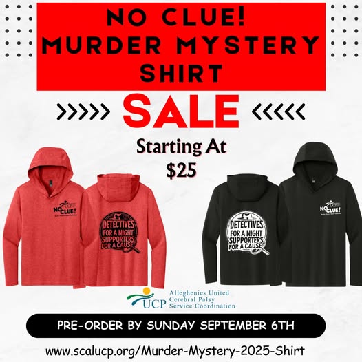 Pre-Order Your 2025 No Clue! Murder Mystery Shirt! Show your support in style with our exclusive 50/25/25 poly/combed ring spun cotton/rayon blend long-sleeve hooded shirts—soft, comfy, and perfect for the Murder Mystery Event of the Year! ⚫ Available in Red or Black 📏 Adult Sizes XS–XL: $25 📏 Adult Sizes XXL and up: $30 📅 Preorder Deadline: Sunday, September 6th at Midnight 🎟 Attending the Murder Mystery Dinner on Saturday, September 13th? Your shirt will be ready for pickup that night! 🙌 Not attending? Shirts can be picked up at a later date after the event. 👉 Reserve yours now: https://www.zeffy.com/en-US/ticketing/alleghenies-united-cerebral-palsys-murder-mystery-shop #MurderMystery #NoClue2025 #JohnstownEvents #SupportAUCP (fb)