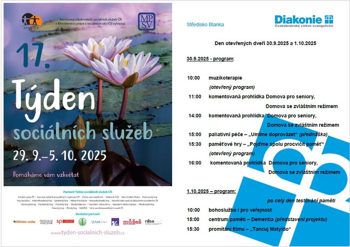 !Týden sociálních služeb 2025 se blíží! Srdečně vás zveme na Dny otevřených dveří v Diakonii ČCE – středisku Blanka v Písku, které se uskuteční 30. 9. – 1. 10. 2025. 📍 Jiráskovo nábřeží 2443, Písek 👉 Přijďte se podívat, jak to u nás vypadá a zúčastnit se bohatého programu! 💙 Po celý den 1. 10. bude také možnost provedení odborného testování paměti. ➡️ Přijďte se zeptat, podívat i zažít atmosféru našeho střediska. Těšíme se na vás! (fb)