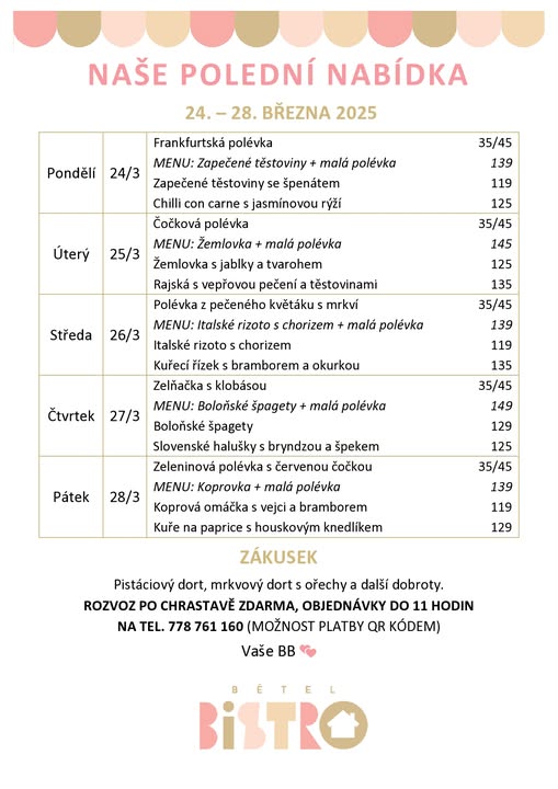 DNEŠNÍ NABÍDKA: Zelňačka s klobásou 35/45 ZVÝHODNĚNÉ MENU: Boloňské špagety + malá polévka 149 Boloňské špagety 129 Slovenské halušky s bryndzou a špekem 125 Dort Míša, kremrole z Moravy a další zákusky dle nabídky. OBJEDNÁVKY DO 11 HODIN NA TEL. 778 761 160 ROZVOZ JÍDEL PO CHRASTAVĚ ZDARMA MOŽNOST PLATBY QR KÓDEM (fb)