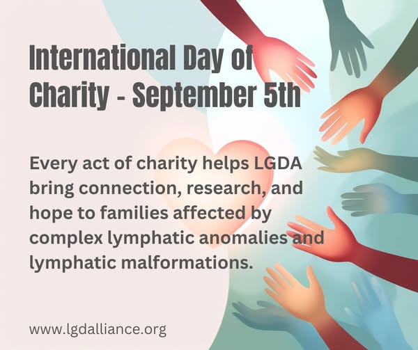 🌍 Today is International Day of Charity – a day to celebrate the power of giving! 💛 Originally a Hungarian civil society initiative to honor Mother Teresa on the anniversary of her passing, September 5 became a worldwide platform for charitable action when the UN declared it an international holiday in 2012. Mother Teresa’s legacy reminds us that even small acts of charity can make a lasting impact, alleviating suffering and creating more inclusive, resilient communities. At LGDA, patient voices guide our work – from connecting families with peers and care networks, to advancing research and educating the medical community. Together, we help and support patients with complex lymphatic anomalies (CLAs) and lymphatic malformations 💜 There are many ways to get involved this International Day of Charity: ✨ Volunteer your time ✨ Make a donation to support our work - https://bit.ly/40oPlmO Every action, big or small, creates hope and makes a real difference. Check out our website to find out how to get involved - www.lgdalliance.org .💖 #InternationalDayOfCharity #LGDA #ComplexLymphaticAnomalies #LymphaticMalformations #GiveHope #PatientVoicesMatter (fb)