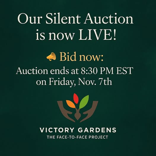 ✨🌱 Our Victory Gardens Benefit Silent Auction is LIVE! 🌱✨ We’re excited to invite you to be part of our annual Victory Gardens Benefit—even if you can’t join us in person. Our Silent Auction is now LIVE, and you can place your bids starting today. 💻 Bid now: https://ibidmobile.net/f2f/auction/ 🗓️ Auction ends at 8:30 PM EST on Friday, Nov. 7th Whether you're attending in person or bidding from afar, your support makes a big difference. Throughout the auction, you’ll receive outbid notifications by email or text, so you’ll always know where you stand. Be sure to check back before the auction closes in case you’ve been outbid —and feel free to place a final bid if you want to increase your chances! #fundraiser #SilentAuction #supportthecause #facetoface #victorygarden (fb)