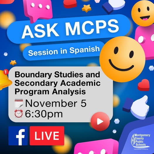 💬 Your questions, answered—in Spanish! MCPS is hosting Pregúntale a MCPS, where you can ask about new school boundaries and secondary school programs, while learning how students can access more opportunities and resources. (fb)