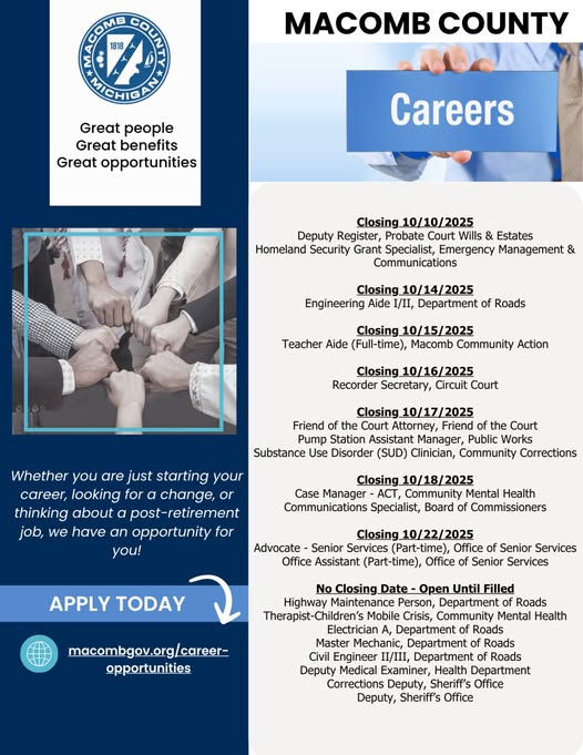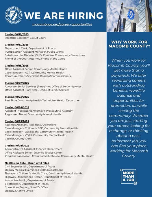 Macomb County is hiring! Why work with us? We proudly offer our employees a wide range of benefits, including full medical, dental, and vision coverage for you and your family members with zero paycheck deductions, paid holidays, and time off accrual programs. Hear what our employees have to say about why they love working here and continue to choose Macomb County every day as the place they want to work: https://www.macombgov.org/departments/human-resources-and-labor-relations/why-we-work-macomb-county If you're ready to join our team, explore our current opportunities and starting your application today: https://macombgov.wd1.myworkdayjobs.com/External #OpenToWork #MacombCountyJobs #PublicService (fb)
