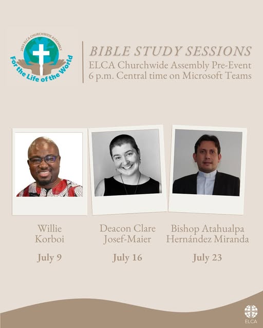 Join us for a series of online Bible studies as we prepare for the 2025 ELCA Churchwide Assembly! Each session will focus on our assembly theme, "For the Life of the World," through one of three lenses — climate justice, gender justice, or war/conflict and reconciliation — and allow attendees to engage with the presenters. Sessions will be held Wednesday evenings (July 9, 16 and 23) from 6 to 6:45 p.m. Central time. Register today: https://www.elca.org/about/leadership/churchwide-assembly/2025-cwa-pre-events (fb)