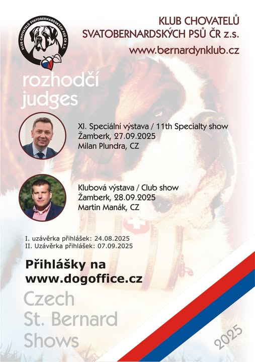 VÝSTAVY V ŽAMBERKU 2025 Vážení chovatelé, dnes jsme zveřejnili propozice a jména rozhodčích na naše výstavy v Žamberku. XI. Speciální výstavu svatobernardských psů bude v sobotu 27.9.2025 posuzovat předseda klubu pan Milan Plundra. Klubovou výstavu svatobernardských psů bude posuzovat v neděli 28.9.2025 pan Martin Manák. Přihlašování spuštěno přes www.dogoffice.cz XI. Speciální výstava Žamberk 2025: https://www.bernardynklub.cz/vystavy/detail.php?id=2616 Klubová výstava Žamberk 2025: https://www.bernardynklub.cz/vystavy/detail.php?id=2615 (fb)