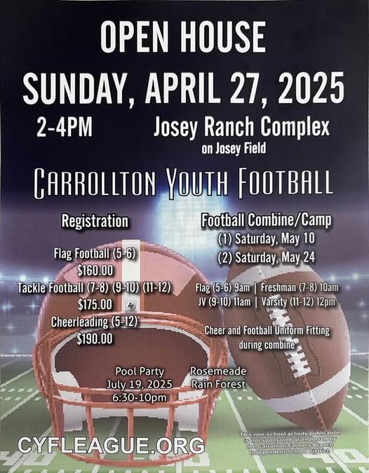 Market your business with CYFL Tell people why this is important 2025 Fall Registration Register Now Register now to secure your spot in the 2025 season. Apply to Coach in CYFL Make a difference in our community by applying to lead our youth to victory. Carrollton Youth Football League The Carrollton Youth Football League is a local 501c3 organization in Carrollton TX that provides youth flag football tackle football cheerleading and drill team dance for local youth ages 5 12 years old. With a rich history that dates back to generations in many local families CYFL has thrived to instill sportsmanship perseverance and push our youth to excel to their maximum capacity.