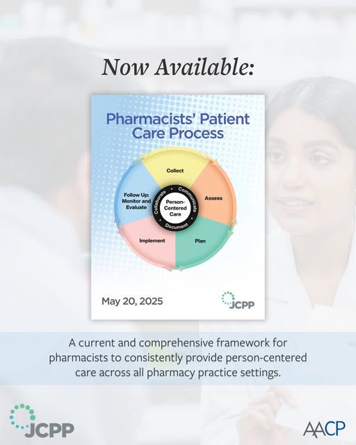 Newly Released: The Joint Commission of Pharmacy Practitioners (JCPP) recently announced the release of the "2025 Pharmacists’ Patient Care Process (PPCP)," an update to the 2014 PPCP, intended to reflect pharmacists’ contemporary practice and evolving trends in the #healthcare system. The result of a comprehensive two-year effort by a workgroup of 14 national pharmacy organizations, the 2025 PPCP offers a current and comprehensive framework for #pharmacists to provide person-centered care across all pharmacy practice settings. Further, it reinforces pharmacists' critical contributions to optimizing #medication and health outcomes, reducing healthcare costs, and advancing population health. To read more, see the link in our comments. (fb)