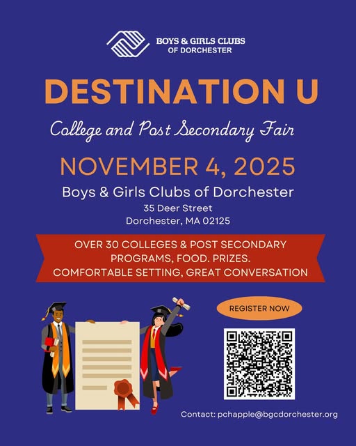 DESTINATION U is back! 🎓 Don’t miss our College & Post-Secondary Fair on November 4, 2025! 📍 Marr Club 35 Deer Street, Dorchester, MA 02125 🤝 Meet with reps from over 30 colleges & programs Enjoy food, prizes, and great conversations in a welcoming, supportive space to explore colleges, technical schools, or other paths! Register using the QR code on the flyer. Questions? Contact: pchapple@bgcdorchester.org. #WeAreDorchester (fb)