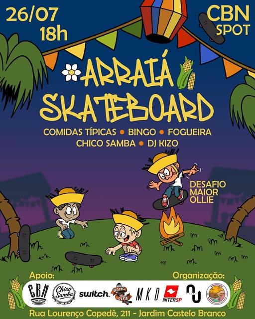 🎉🔥 É SÁBADO ! ARRAIÁ SKATEBOARD NO CBN SPOT! 🎉🔥 🗓️ 26/07 – ⏰ a partir das 18h 📍 Rua Lourenço Copedê, 211 – Jd. Castelo Branco Prepare o chapéu de palha e o sorriso no rosto porque hoje tem festa boa demais, sô! O Arraiá Skateboard chega com tudo pra esquentar o coração e fortalecer nossa cena local 💪❤️🔥 💥 Toda a arrecadação será destinada às melhorias na quadra da RSP Skate Point e para o projeto social @NextUpBrasil, que atua na zona norte de Ribeirão Preto com aulas gratuitas de skate, cultura e cidadania para crianças e adolescentes! 🛹✨ 🎶 No som: 🎤 Chico Samba com aquele samba envolvente 🎧 DJ Kizo tocando as melhores brasilidades pra animar o arraiá! 🔥 Na programação: 🌽 Comidas e bebidas típicas 🎯 Bingo e brincadeiras juninas 🔥 Fogueira 🛹 Desafio do Maior Ollie com premiação pros monstros do pop! Vem fortalecer a cultura, se divertir e fazer a diferença na vida de muita gente! Apoie, compareça e compartilhe! (fb)