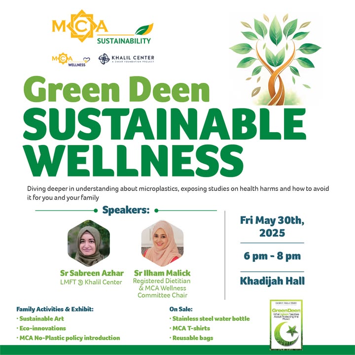 GREEN DEEN: Green Deen: Sustainable Wellness & Microplastics with Art & Eco-Innovation Exhibit 🗓️ Friday, May 30 | 6–8 PM 📍 MCA – KBH Microplastics are inside us—from our brain and lungs to the placenta and endocrine system. Research shows they disrupt hormones, trigger inflammation, and impact our mental and physical health. Join us for a powerful talk on how microplastics are affecting our bodies and what we can do to protect our families and communities. 🎙️ Speakers: • Sr. Sabreen Azhar, LMFT @khalilcenter • Sr. Ilham Malick, Registered Dietitian & Chair, MCA Wellness Committee 🎨 PLUS! Community Art & Eco-Innovation Exhibit Submit by May 25: sustainability@mcabayarea.org 🖼️ Up to 5’x3’ | 🎁 Gifts for accepted pieces! All ages welcome! ♻️ MCA’s No-Plastic Policy Launch 🛍️ Shop: Green Deen Book, MCA shirts, reusable bottles + bags 🌍 Bring Your Own water bottle – it's a #GreenEvent! #GreenDeen #SustainableWellness #MicroplasticsAwareness #EcoInnovation #SustainableArt #PlasticFree #GreenMuslims #MuslimWellness #EnvironmentalJustice #MCAEvents #HealthyUmmah #UpcycledArt #FaithAndEnvironment #BYOBottle #GreenFaith (fb)
