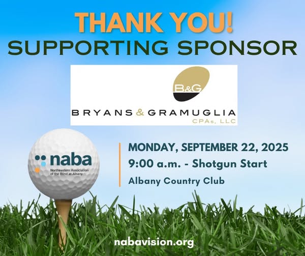 Thank you to Bryans & Gramuglia, CPAs, LLC for supporting the 26th Annual Visionary Golf Tournament at Albany Country Club! Your generous contribution will help NABA continue to fulfill its mission of helping blind or visually impaired individuals in our community achieve growth and independence. To learn more about the tournament or how you can support NABA, please visit nabavision.org (fb)