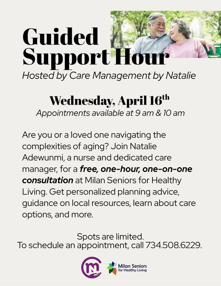 Are you or a loved one navigating the complexities of aging? Get started with a free, one-hour Guided Support session with Care Management by Natalie. You can come for yourself or bring your parent or other loved one. We have two appointments available this month on Wednesday, April 16th. Call 734.508.6229 to reserve your spot. (fb)