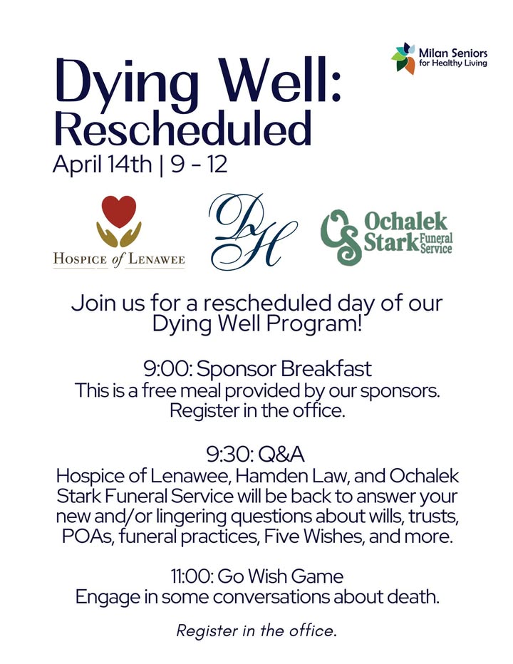 Join us next Monday, April 14th, for the rescheduled day of February's Dying Well Series. Join us for breakfast, a Q&A hosted by Ochalek Funeral Service, Hospice of Lenawee, and Hamden Law, and the "Go Wish Game." This program is free and open to all. To register, call 734.508.6229. (fb)