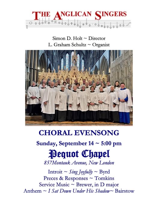 Please join us for our first Choral Evensong of the 25-26 season at Pequot Chapel in New London on Sept 14th! (fb)