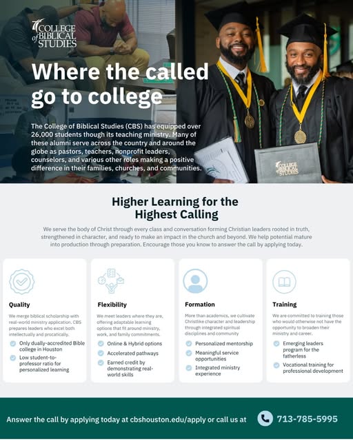 Where the called go to college. Join over 26,000 CBS alumni making a difference in ministry, counseling, education, and more. Answer the call: cbshouston.edu/apply 📞 713-785-5995 #ChristianCollege #MinistryTraining #CBSHouston #BibleCollege #CalledToLead #NowEnrolling (fb)