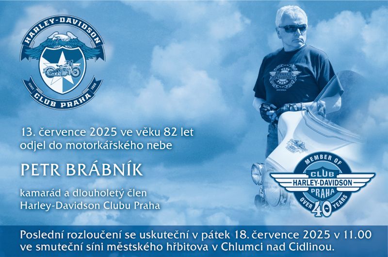 S lítostí v srdci oznamujeme všem kamarádům, že nás navždy opustil náš kamarád a dlouholetý člen Petr Brábník. Do motorkářského nebe odjel ve věku 82 let. Poslední rozloučení s Petrem se bude konat v pátek 18. července v 11.00 hodin ve smuteční síni městského hřbitova v Chlumci nad Cidlinou. Nejbližším pozůstalým vyjadřujeme naší nejhlubší soustrast. (fb)