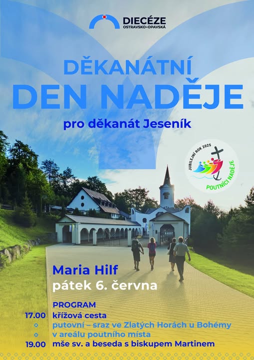 Povzbuzujeme k účastí a zveme na den naděje našeho pěkného děkanátu v pátek 6. června na poutním místě Maria Hilf. Povzbuzujeme k hojné účasti věřící z farnosti Zlaté Hory a z farnosti Zlaté Hory - Odřejovice. Kdo na den naděje pojedete autem, prosím nabídnete místo, těm, kdo auto nemají. Ministranti si vezmou ministrantské oblečení. Páteční večerní Mše svatá ve Zlatých Horách nebude – setkáme se na Maria Hilf. Svatý rok 2025 vybízí k putování a jedním z cílů mohou být i Jubilejní chrámy diecéze. Právě ony mají být podle papeže Františka místy, „kde se lidé mohou dotknout naděje“. „Svaté brány v Římě se zdají být daleko, ale milostí Jubilejního roku se můžeme dotknout i v naší diecézi. Budu rád, když se na děkanátní pouť vypravíte se svou farností a nabídnete třeba společnou cestu těm, kdo se sami nevypraví,“ zve biskup Martin David. Děkanátní dny naděje jsou příležitostí k setkání mezi farnostmi i modlitbě a diskuzi s otcem biskupem Martinem /zdroj: doo.cz/. www.farnostzlatehory.cz (fb)