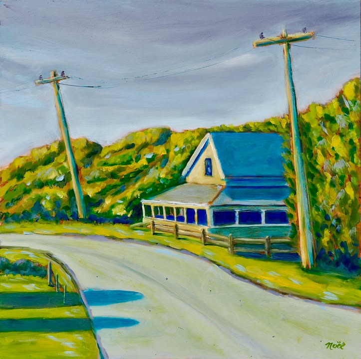 A statement from our Juror Kevin Gilmore for his second place award in ONLY SQUARES APPLY Second Place - After the Beach - Charles Noël This landscape…so much more than a landscape painting. It is a peaceful place, a moment in time, and I am there with all of my senses. Perhaps a coastal town in Maine, a side street on Martha’s Vineyard, Prudence Island, or even Outer Banks, NC. And it is a place I could just be, exist, for a very long time, in the quietude the artist presents here. Something feels slightly surreal in the way the artist uses colors. It’s not precise,teetering on impressionistic, yet describes the moment with deep emotion, reflective, contemplative. The sky is full of grays, as if a storm is coming, yet the warm glows of a setting sun drenches the foliage, cottage, and road. It feels like the rare occurrence when the 90% of the sky is ready to drop a deluge of rain, but in the west, the sun is setting below this low cloud storm front piercing the landscape with remaining light. Compositionally, what I found most stunning is the interplay between the two telephone poles and the two shadows in the foreground. The heavy lean of the left pole describesthis scene, one steeped in tradition, old, untouched for decades - a kind of “if it ain’t broke, don’t fix it” feeling. The one on the right seems to be saying, “hey it’s all good…”To personify these structures may seem silly, but it is reminiscent for me of the trees in Four Trees (1917) painted by Egon Schiele - they each have their own personality. The two poles point to the left, which as the eye moves around the painting, the two shadows point to the right. It is within this compositional zig-zag that the cottage sits, untouched, quiet, stoic. The artist’s composition, paint strokes, and color choices create the atmosphere, the sense of place, the time of day, leaving the viewer to make up stories about what is inside the cottage. I picture mix-matched dishes and repurposed jelly jars for drinking lemonade, old monopoly board games and checkers with bottle caps and tarnished pennies that replaced missing pieces, frayed and warn couches, wood paneling,containers of shells and sea glass, and avocado-green appliances. The opportunity to reflect on my own personal memories of vacation cottages is given tome by this artist through their intuitive color play, direct plein-air style handling of oil paint, and attention to composition. The subtle catenary drooping of the old electric andlines, rendered with a tiny brush and the back of a brush scratched are like the final punctuations left by the painter. Beautiful experience seeing this painting. (fb)