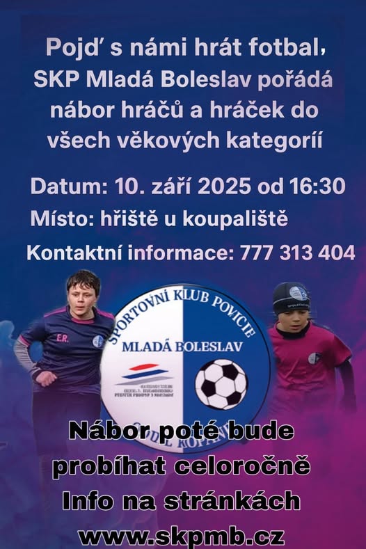 GÓLY STŘÍLÍM ZA SKP! Chceš být trenér, nebo hráč? Chceš střílet góly za tradiční fotbalový klub v Mladé Boleslavi? Nebo jim naopak zabraňovat? Přijď ve středu 10. září v 16:30 na hřiště "U koupaliště", kde pořádáme nábor chlapců a dívek do mládežnických týmů, všech věkových kategorií. Staň se jedním z nás! SKP - Společně za vítězstvím! Nezapomeň! Středa 10. září 2025 v 16:30 na našem hřišti. Tak neváhej a přijď na SKP. #skpmb #skp #skpmladaboleslav #spolecnezavitezstvim #hristeukoupaliste #tjtechnickesluzbymb #rudahvezdamb #fotbalmladaboleslav #mladaboleslav #fotbal #lovefootball #okresnifotbal #nabor (fb)