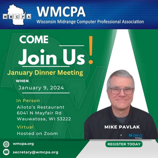 Thursday, January 9th, WMCPA January 2025 Dinner Meeting Speaker! We are very excited to have Mike Pavlak come back and present for us! Register: https://bit.ly/4fHsI2A Alioto's Bar & Grill 3041 N Mayfair Rd, Wauwatosa, WI 53222 View on map: https://bit.ly/3zOvx2W Session 1 (4:30 PM) Stored Procedures for Hybrid Development Accessing business logic from Open Source application and off platform has evolved a great deal over the years. In this session we’ll look at some of the reasons for centralizing this business logic in the database via Db2 Stored procedures. Session 2: (7:30pm) The Business Value of Open Source on IBM i Explores how open source complements heritage systems of record in IBM i organizations and discusses ROI. Find Us! WMCPAWMCPA.org Our WMCPA Board: Marina Schwenk Rochelle Petty Ajay Gomez Jim Buck Peter Langhammer Shane Poad Caracal Keithrafferty Jean Boris Konan Angela Pocklington Santos Boudreaux Izac Ordonez Sponsors: imPower Technologies Interested in being a sponsor?!? Contact us at: sponsordir@wmcpa.org #IBM #IBMi #WMCPA #usergroup #icon25 @followers (fb)