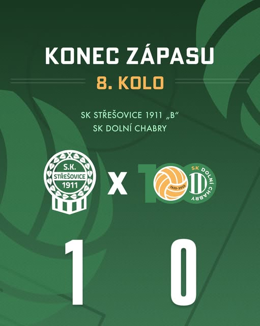 ❌ Střešovice 1911 1:0 SK Dolní Chabry ❌ V osmém kole jsme na půdě Střešovic bohužel podlehli nejtěsnějším rozdílem 1:0. I přes bojovný výkon a šance se nám tentokrát nepodařilo skórovat. Nevadí — jde se dál a soustředíme se na další utkání. 💪💚🤍 📅 Už příští sobotu nás čeká domácí zápas proti Řeporyjím. 🔊 Přijďte nás podpořit a pomoct týmu vrátit se zpět na vítěznou vlnu! #skdolnichabry #fotbal #8kolo #strešovice #jdemedal #domacizapas #reporyje (fb)