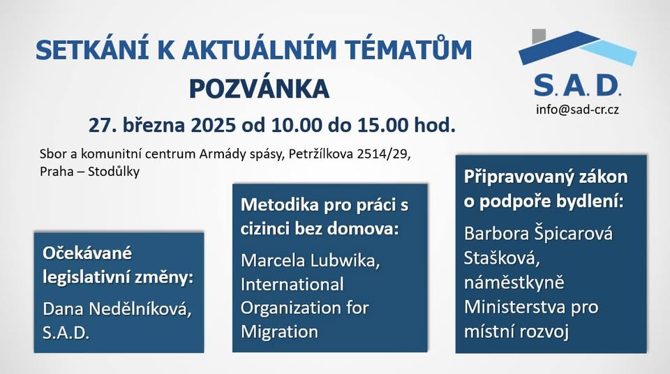 [1] https://sad-cr.cz [2] https://sad-cr.cz/homeless-in-europe/ [3] https://sad-cr.cz/sad/ [4] https://sad-cr.cz/newsletter-feantsa/ [5] https://rejstrik-firem.kurzy.cz/49276077/sit-akteru-pro-domov-z-s/
