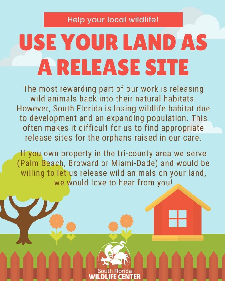 Do you own property in Broward, Miami-Dade, or Palm Beach County and want to support local wildlife? We have an exciting opportunity for you! The Wild Home Project is an initiative that helps identify safe, suitable locations for wildlife releases—especially during baby season, our busiest time of year. As we care for hundreds of orphaned animals, we look for welcoming spaces where they can safely return to the wild. If you’re interested in making your property part of this important effort, we’d love to hear from you! 📧 Please contact us at info@southfloridawildlifecenter.org to learn more. Help us give wildlife a second chance—right in your own backyard. #NonProfit #WildHome #StayWild #SFWC (fb)