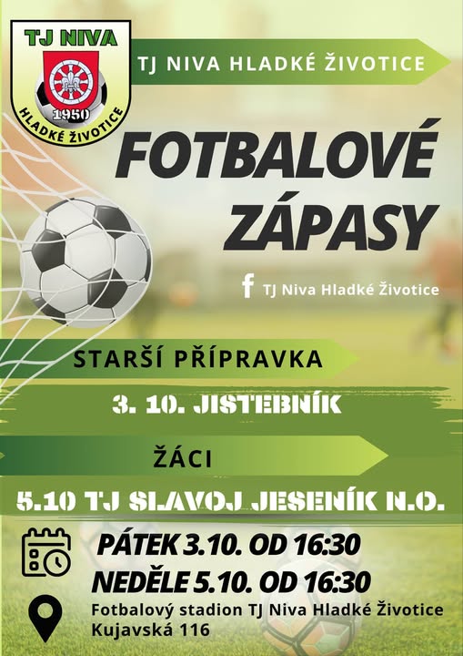 TENTO TÝDEN DOMA PŘÍPRAVKA A ŽÁCI! V pátek 3.10. sehrají další utkání naši malí že starší přípravky. Soupeř jim přijede z Jistebníku a začátek je v plánu od 16:30. Jak jsme již psali, v tu samou dobu budou ve 2 "arénách" tzn. hřiště s mantinely, budou hrát turnaj 4 mužstev Studénka, Děrné, Pustějov a naši prcci. V neděli 5.10. pak čeká naše žáky další zápas a to když přivítají od 12:30 TJ Slavoj Jeseník nad Odrou! Soupeř má po 5 odehraných zápasech 4 body a jsou na 6. místě. Naposledy prohráli s Děrným 2:9. To naši jsou po nedělní výhře nad Vražným 3. s 10 body. (fb)