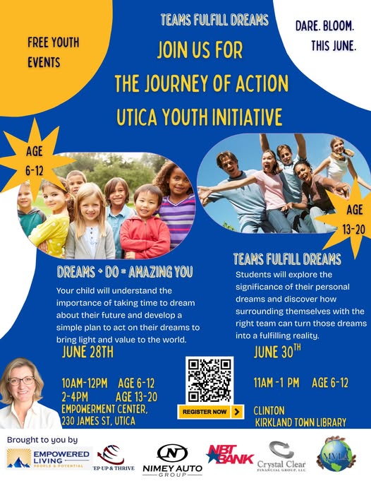 🌟 Complimentary Youth Events for Mohawk Valley Families! 🌟 We invite you to join @StepUp&Thrive for FREE events designed to spark imagination, build confidence, and plant seeds for a bright future. These aren’t just fun community activities—they're transformational experiences created by world-class educators who believe in the greatness within every child and teen. 📍 Saturday, June 28th in Utica (for both age groups) 📍 Monday, June 30th in Clinton (ages 6–12 only) Registration➡️ https://forms.gle/jNMx6G1jDSfmEd519 (fb)