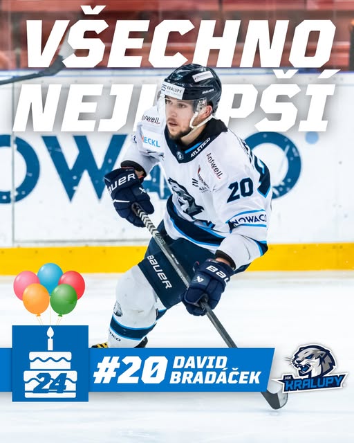 🥳 David Bradáček má narozeniny 🤩 Kralupská stálice se šesti sezónami s vydrou na prsou v zádech a jeden z hlavních strůjců postupu do 2. ligy před dvěma lety dnes slaví 24 let 🍾 Bredly, všechno nejlepší a ať se na ledě i mimo něj všechno jen daří 🍀 #narozeniny #druhaliga #spolecnezakralupy (fb)