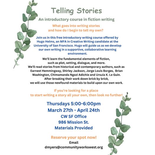 Calling all writers, artists, and creatives! ✍️ We’ll get back to the basics and learn about the fundamentals of writing. Whether you're a seasoned writer or just starting, join us for an engaging series! Reach out to dmyers@communityworkswest.org for more information #CommunityWorks #JusticeDemandsHumanity #RestorativePractice #ReclaimingAgency (fb)