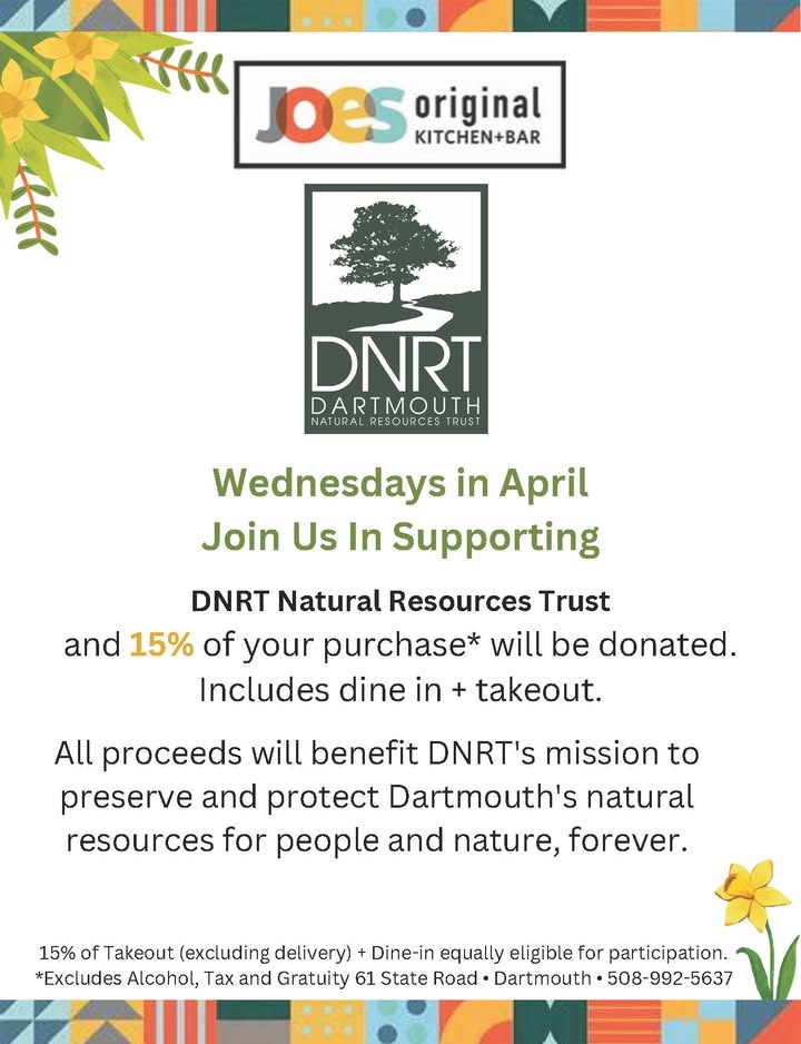It's time again! Dine in or take-out at Joes Original Kitchen + Bar any Wednesday in April and mention DNRT when placing your order. 15% of your check will be donated to DNRT! It's a win-win! (fb)