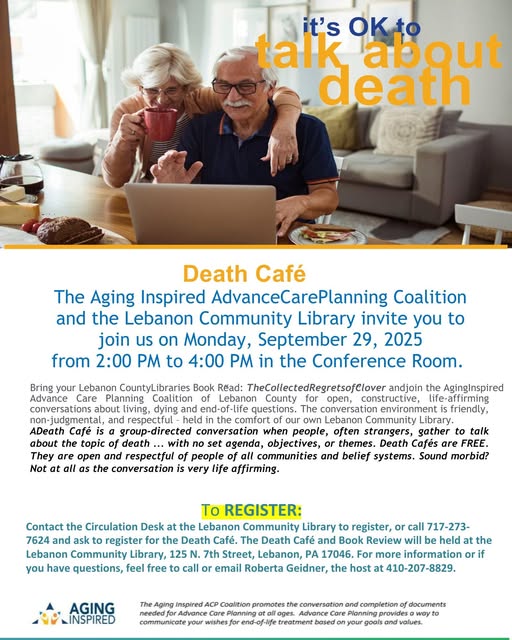 ☕💬 It’s OK to talk about death. Join us at the Lebanon Community Library for a special Death Café. What’s a Death Café? It’s a welcoming, open conversation where people (often strangers!) come together to talk about life, death, and everything in between. There’s no agenda, no judgment, and no cost—just honest, life-affirming discussion. ✨ Free & open to everyone. 📍 Lebanon Community Library, 125 N. 7th Street, Lebanon, PA 📞 Register at 717-273-7624 or stop by the circulation desk. Let’s break the silence and talk openly about what matters most. 💛 (fb)