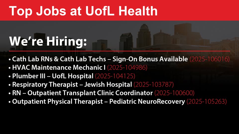 NEW WEEK, NEW POSSIBILITIES | Looking for a role where you can thrive and make an impact? Explore UofL Health’s Top Jobs for the week of Oct. 20, 2025. Learn more about working at UofL Health/apply ▶️ ULHealth.co/careers (fb)