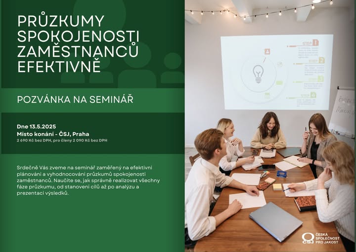 Dne 13.5.2025 se v prostorách ČSJ uskuteční seminář na téma "Průzkumy spokojenosti zaměstnanců efektivně". Obsah semináře je zaměřen na pracovníky odpovídající za průzkumy spokojenosti zaměstnanců na všech úrovních činností - plánování, realizace a vyhodnoceni. Budeme se na Vás těšit. https://www.csq.cz/vzdelavani/detail/pruzkumy-spokojenosti-zamestnancu-efektivne #vzdelavani #spokojenostzamestnancu #kvalitavydelava #HR #seminar (fb)