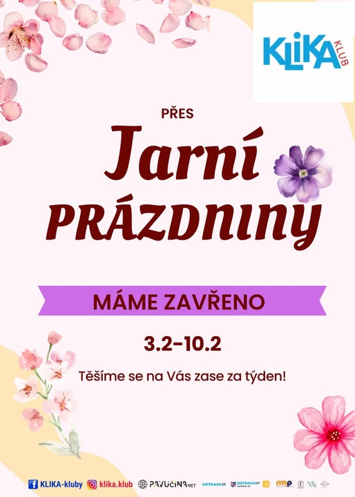 Přátele, během jarních prázdnin budou klika kluby zavřené, budeme se na vás těšit opět v pondělí 10.2. 😉👍 (fb)