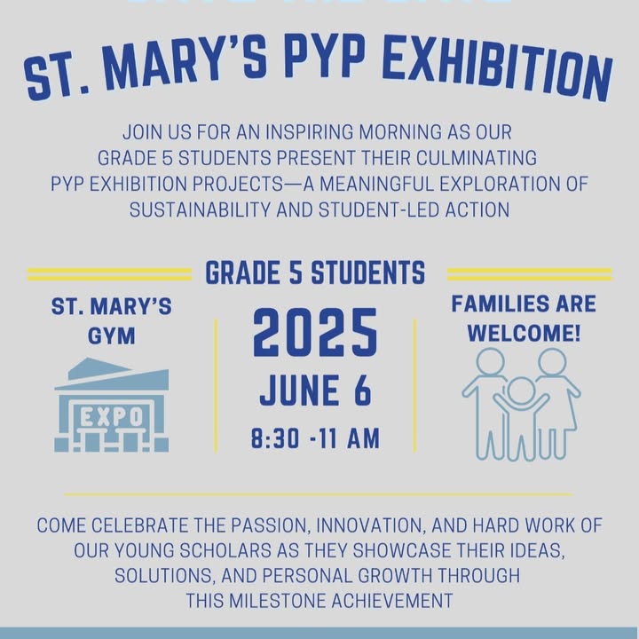 Save the Date! 🌱🌎 Our Grade 5 students are tackling sustainability in this year's PYP Exhibition on June 8:30-11am in the Gym! Witness our young IB learners as they take action on real-world issues. This student-led inquiry is the culmination of their PYP journey. Join us for an inspiring expo-style presentation of their learning and growth! #PYPExhibition #IBWorldSchool #Sustainability #StudentLedInquiry #StMarysIB #IBLearnerProfile #MakingADifference #Education #Grade5 #InquiryBasedLearning (fb)