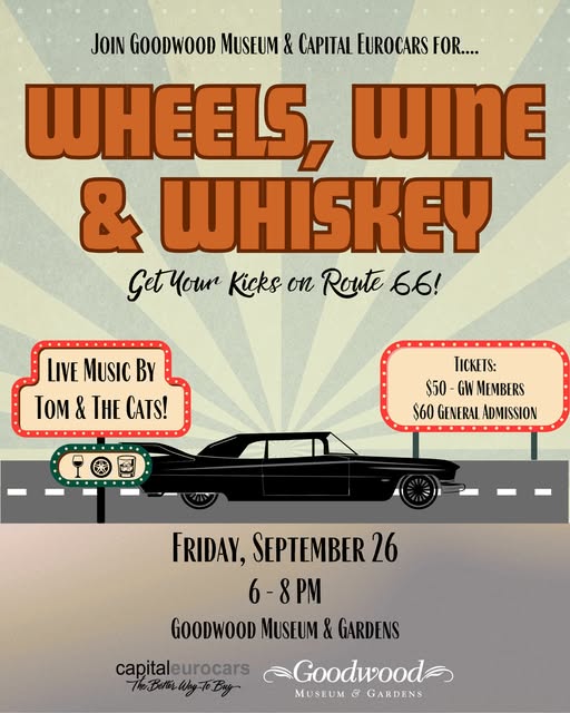 🚗🍷🥃 SAVE THE DATE: Wheels, Wine & Whiskey is Back! We’re hitting the road Route 66 style at Goodwood Museum & Gardens on Friday, September 26, 2025! Get ready for a night of classic cars, mid-century fashion, retro tunes, and premium wine & whiskey tastings, all to benefit one of Tallahassee’s most treasured historic sites. ✨ Live music by Tom & The Cats (hits from the 50s, 60s, and 70s) ✨ Passed hors d’oeuvres + curated wine & whiskey bars ✨ Vintage car showcase celebrating America’s golden age of highways ✨ Dress in your best vintage or road-trip chic and dance under the oaks! This is one of Goodwood’s most anticipated events — and tickets will go fast! Get your tickets TODAY! https://www.eventbrite.com/e/wheels-wine-whiskey-get-your-kicks-on-route-66-tickets-1583060970979?aff=oddtdtcreator (fb)