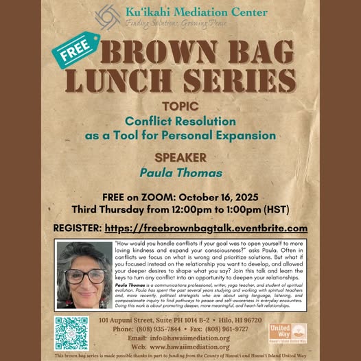Join Kuikahi Mediation Center and Paula Thomas on Thursday, October 16 at 5:00pm Central Time for a free webinar: "Conflict Resolution as a Tool for Personal Expansion" - for more information and to register visit https://hawaiimediation.org/events/ (fb)